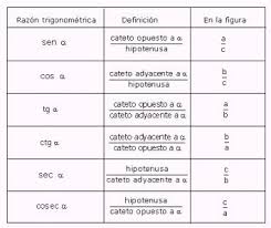 Una razón trigonométrica es una razón de las longitudes de dos lados de un triángulo rectángulo. Las tres razones trigonométricas básicas son el seno, el coseno, y la tangente. Éstas se abrevian como sen, cos y tan.
